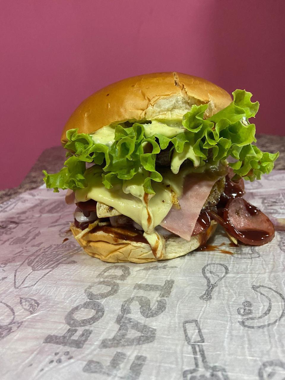 (13) - X-IDEALPão , 2 hambúrgueres, mussarela, presunto, 2 ovos, bacon, tomate e alface.R$ 22,00 -
